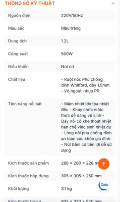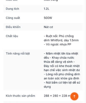– Ruột nồi: Phủ chống dính Whitford, dày 1.5mm – Vỏ ngoài: nhựa PP